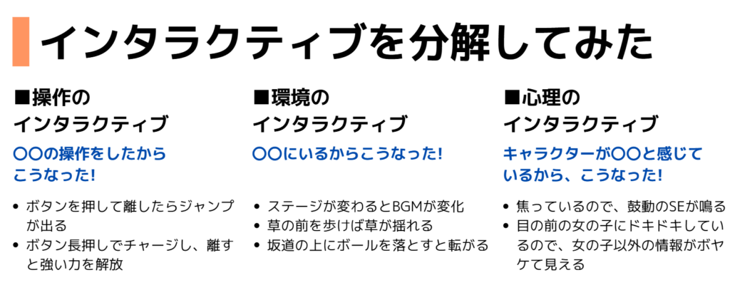このインタラクティブな要素は、大きく操作/環境/心理という軸に分けられるはずである。