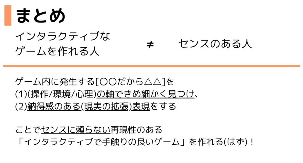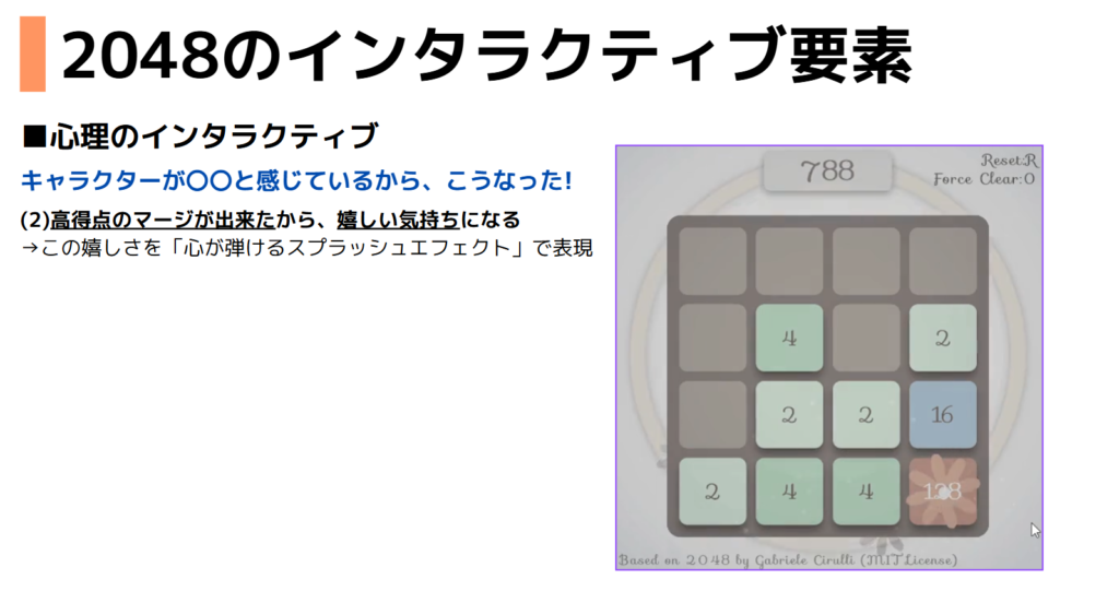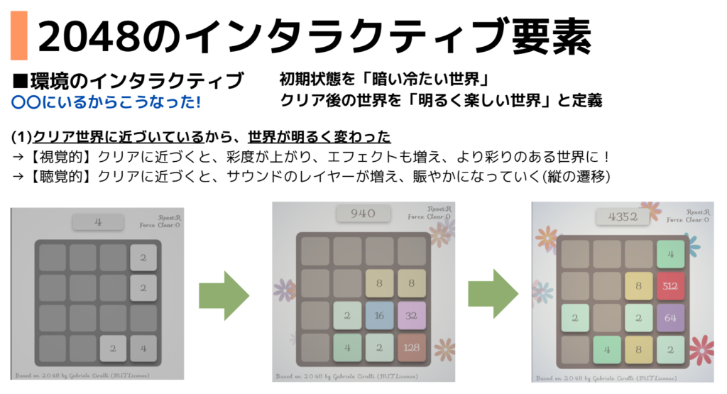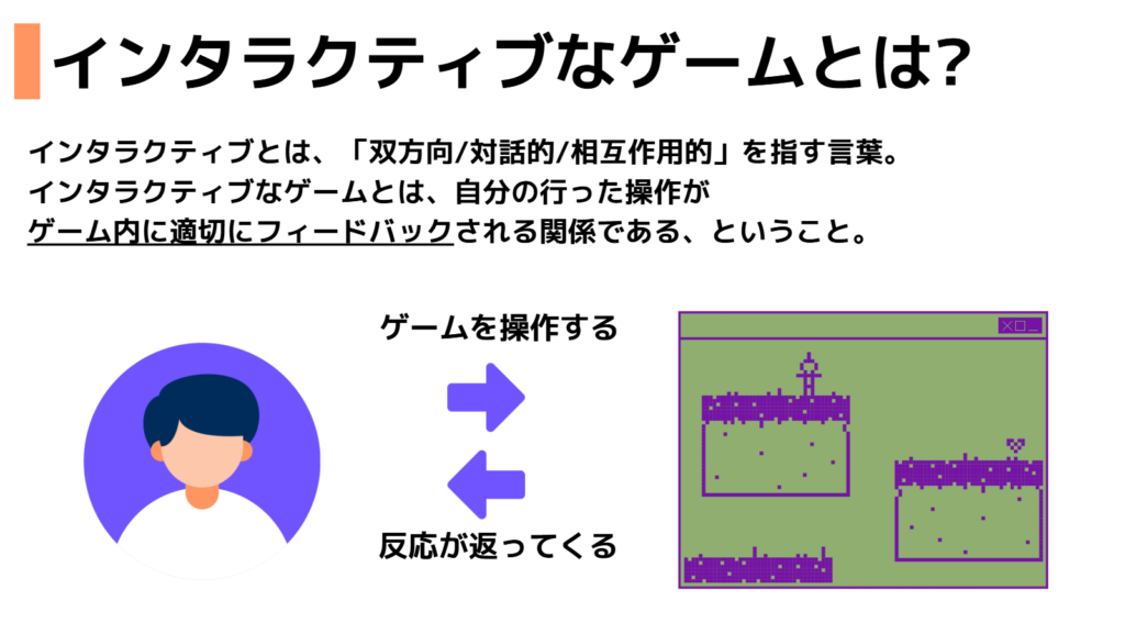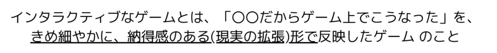 「〇〇だから△△が起きる」ということを、ゲームの中に反映していくことで、よりインタラクティブなゲームになる。